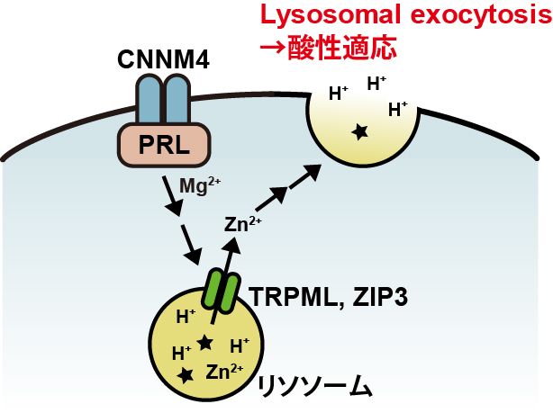 Among trace metal elements, zinc is known to be involved in signal transduction. Recent reports also show that zinc is stored in lysosomes, but whether lysosomal zinc participates in signal transduction has remained unknown. We found that overexpression of PRL, a driver of cancer malignancy, promotes lysosomal exocytosis, a fusion of lysosomes with plasma membrane and subsequent release of their ingredients, such as condensed H+. We also revealed that this phenomenon alters the cellular response to environmental pH and make cells optimized to acidic environment observed in malignant cancer tissues, and that TRPML1 and ZIP3, exporters of zinc from lysosomes, are necessary. These results suggest that lysosome-stored zinc plays as a “signal” and promote lysosomal exocytosis and acid adaptation, and in this study we demonstrate the importance of lysosomal zinc as a signal messenger by exploring the molecular mechanism of this phenomenon.
