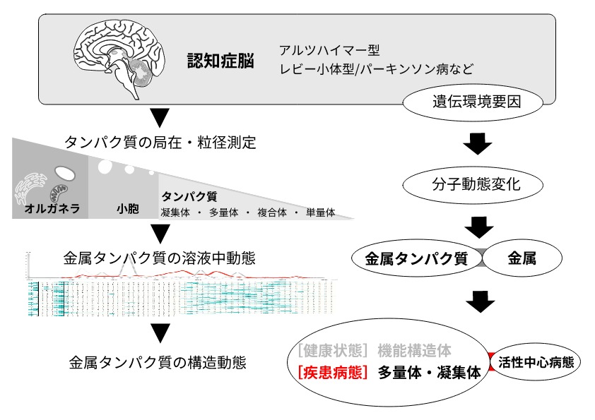 To date, the multimerization and aggregation of pathogenic proteins have been reported in some types of dementia. However, there are only a few key proteins reported as critical candidates to display the pathogenic molecular dynamics in the disease conditions. This research project will uncover the specific pathogenic molecules through integrated multi-level analyses from the postmortem brains of patients of dementia (Alzheimer’s disease, Parkinson’s disease, dementia with Lewy bodies) to the molecular dynamics of pathogenic metalloproteins and bio-metals. As fruits of this research project, we will know the critical pathological molecular dynamics that can explain much clearly about the pathogenesis and specific biomarkers of dementia.