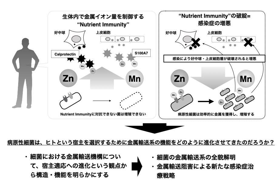 Since bacteria adapt to extremely diverse environments on the earth, it is thought that they have evolved independently according to the environment. Therefore, the metal-acquiring system and excretion system of these bacteria are very important factors that determine the niche of the bacteria. It is known that metal elements such as iron, zinc, and manganese are essential for the so-called “pathogenic gene expression induction mechanism” that is the key to the expression of pathogenicity by bacteria, but in humans and other living bodies, There is a mechanism called nutrient immunity that inhibits the acquisition of essential metals in bacterial species. In response to this, pathogenic bacteria have evolved their high-affinity metal transport system to exert pathogenicity in vivo, and as a result, they have a unique metal transport system depending on the environment. However, little research has been done on the question of “how the metal transport system evolves at the genus/species level of bacteria to adapt to the host and participate in pathogenicity”. In this study, we will clarify how evolutionary aspects of pathogenic bacteria have evolved the function of the metal transport system to select the host. I would like to elucidate the functional importance of the metal transport system in the adaptation of pathogenic bacteria to the host.