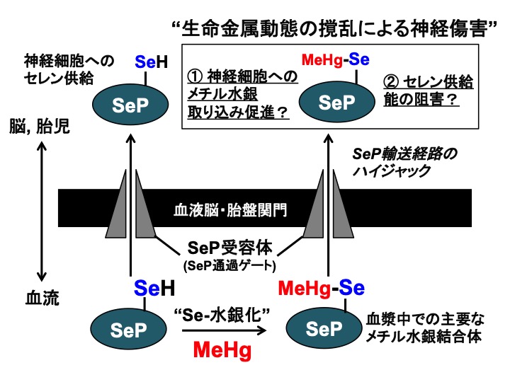 Selenoprotein P (SeP), a major selenoprotein in plasma, holds essential bio-metal selenium as selenocysteine and efficiently supplies the metal to the brain and fetus over the blood-organ barriers via the receptors for SeP. Recently, it has been reported that methylmercury (MeHg), a toxic-metal that causes central nervous dysfunctions in fetus (and also adult), circulates in the blood stream with binding to selenocysteines of SeP in plasma. These suggest that MeHg hijacking SeP and jailbreaking the blood-organ barriers like Trojan horse, and this may be contribute to the toxicity of MeHg. Our preliminary study also suggested that efficiency of selenium supplementation by SeP to neuronal cells was significantly inhibited by MeHg may be due to the strong binding with selenocysteine and MeHg. In this research, we will approach these novel hypotheses with original methodologies based on chemical biology.